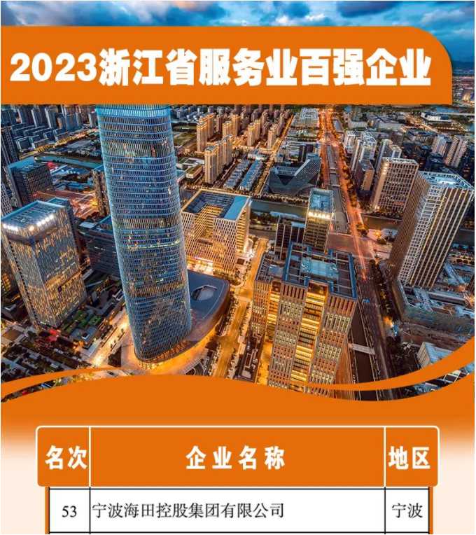 9月27日,浙江省企業(yè)聯(lián)合會、省企業(yè)家協(xié)會、省工業(yè)經(jīng)濟聯(lián)合會聯(lián)合發(fā)布2023年浙江省企業(yè)綜合百強榜及制造業(yè)、服務(wù)業(yè)、競爭力百強榜。其中,寧波海田控股集團再次以強勁實力榮登榜單,位列浙江省服務(wù)業(yè)百強企業(yè)第53位。
