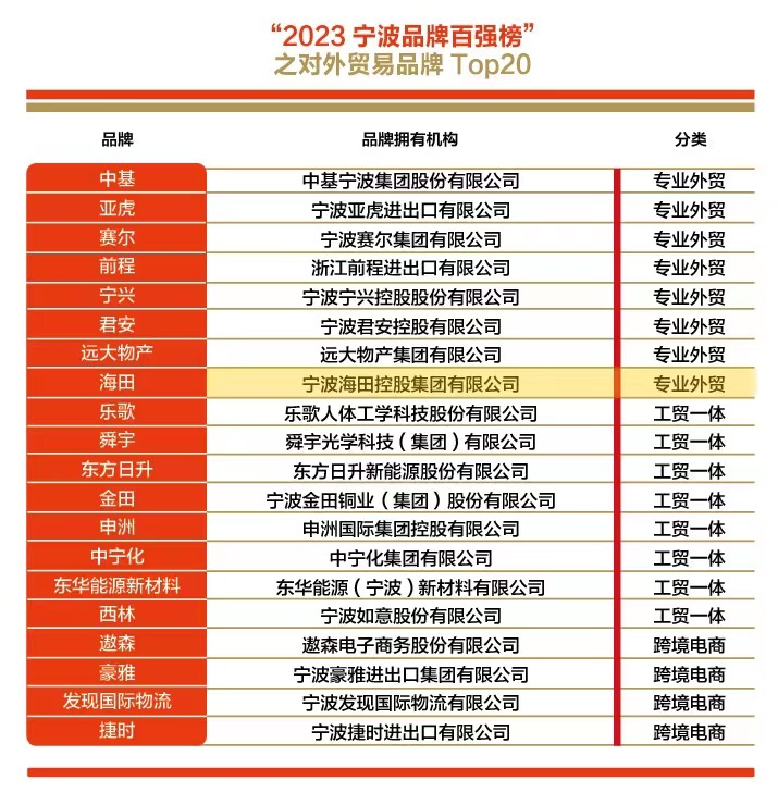 “2023寧波品牌百強(qiáng)榜”出爐 寧波海田控股集團(tuán)榜上有名