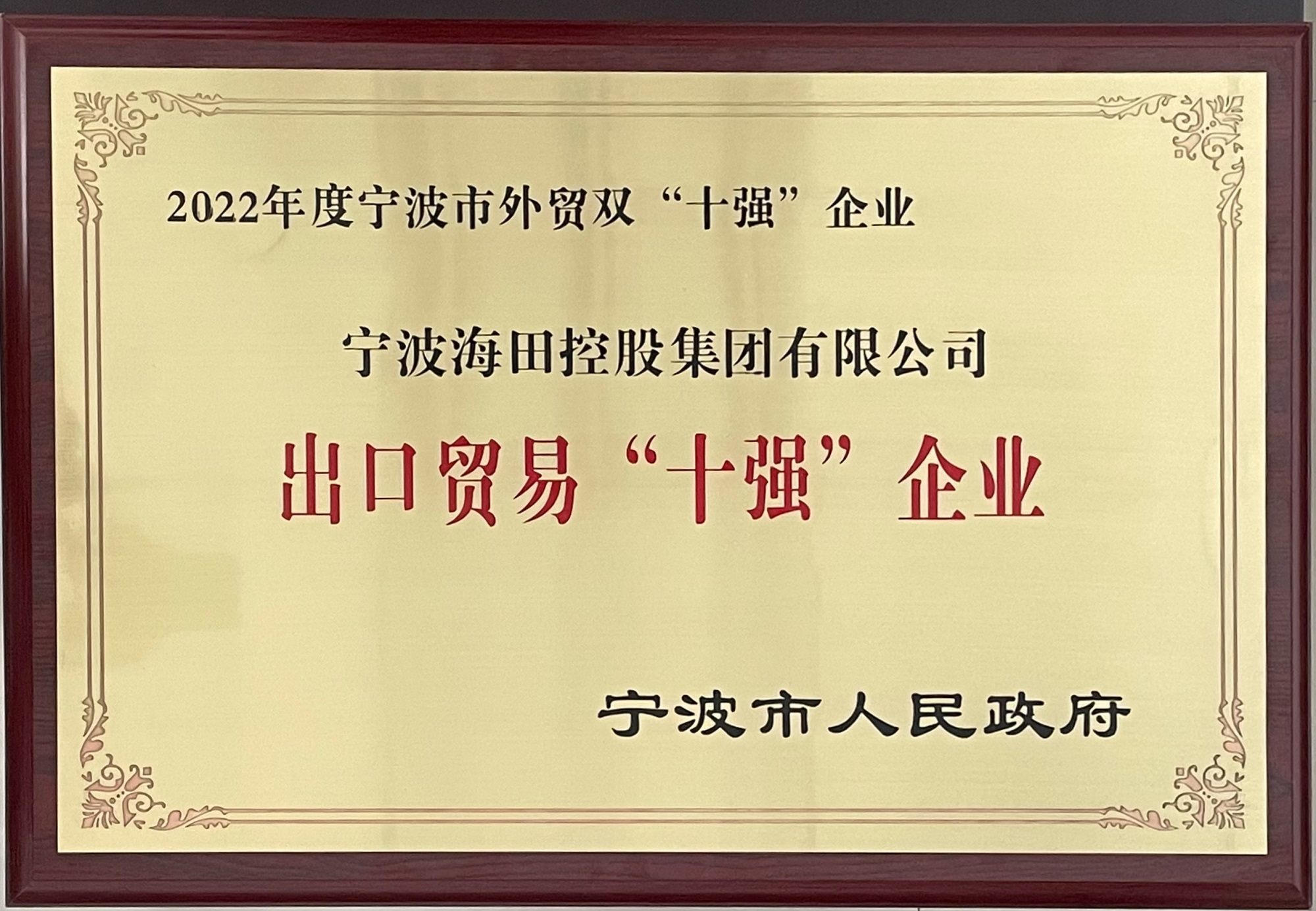 寧波海田控股集團(tuán)榮獲2022年寧波市出口貿(mào)易“十強(qiáng)”企業(yè)