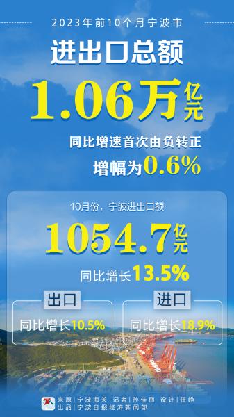 據(jù)寧波海關(guān)數(shù)據(jù)顯示,前10個月,寧波進(jìn)出口總額達(dá)1.06萬億元,同比增速今年以來首次由負(fù)轉(zhuǎn)正,增幅為0.6%。其中,出口額超6900億元,同比增長1.5%;進(jìn)口額超3600億元,同比降幅較前9個月收窄1.9個百分點。